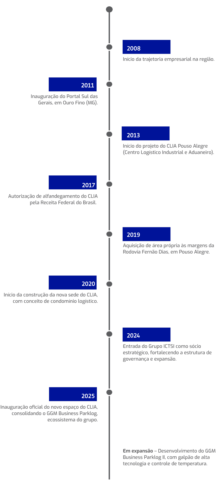 Nos anos seguintes, o GGM expandiu suas frentes de atuação, incorporando transporte rodoviário, locação de espaços corporativos e novos projetos logísticos, formando a estrutura que hoje compõe o GGM Group — um ecossistema preparado para integrar diferentes etapas da cadeia produtiva e impulsionar o desenvolvimento do Sul de Minas.